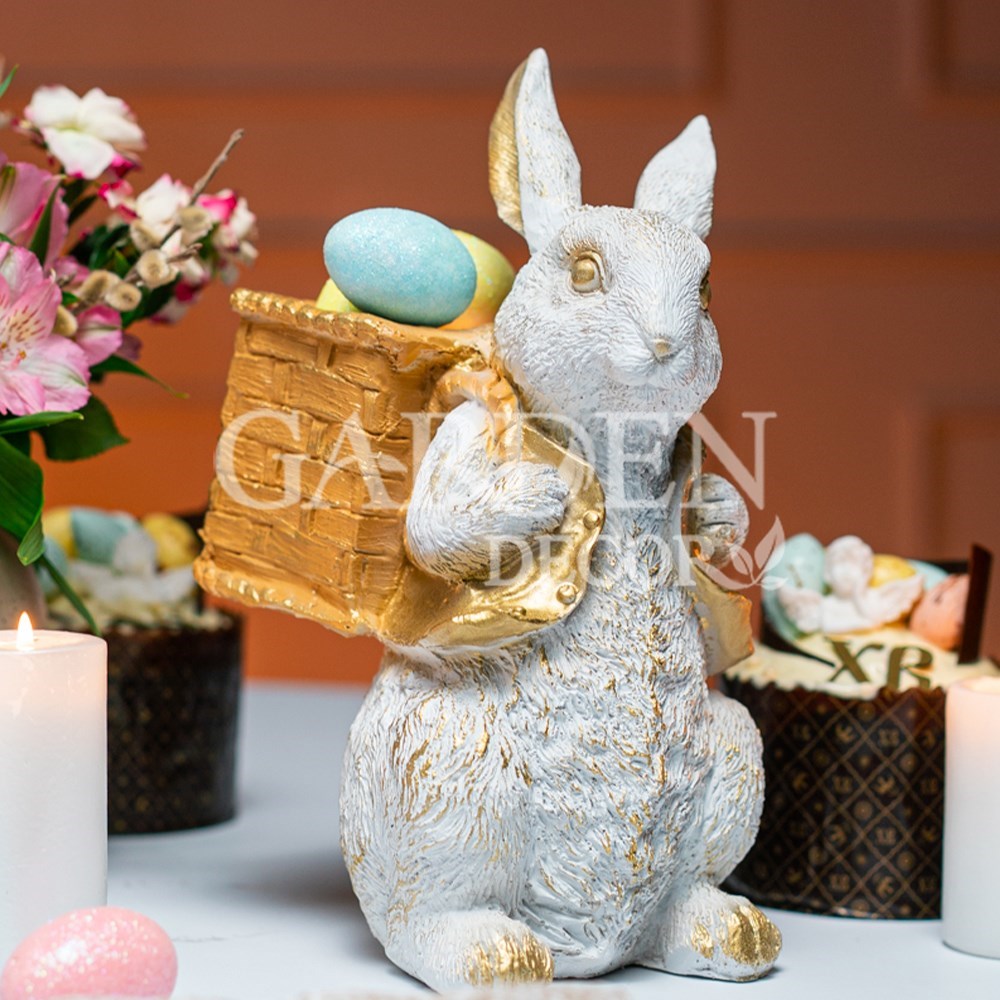 Кашпо садовое фигуры Заяц с корзиной бело-золотой - очаровательный и оригинальный новогодний декор для Вашего интерьера. Милая статуэтка из полистоуна Зайка в натуральной покраске станет красивым украшением вашего дома, офиса, дачи или сада. Декоративная фигурка Заяц прекрасно дополнит интерьер гостиной, прихожей, спальни, ванны, кабинета или кухни, и создаст уют вокруг. Замечательно будет смотреться на столе, полке или под новогодней ёлочкой, отлично дополнит рабочее пространство, прикроватную тумбу или туалетный столик. Скульптуру Кролика можно использовать в детской, спальне, гостиной, а также для оформления праздничных композиций, например с ветвями ели, еловыми шишками и прочей праздничной атрибутикой.