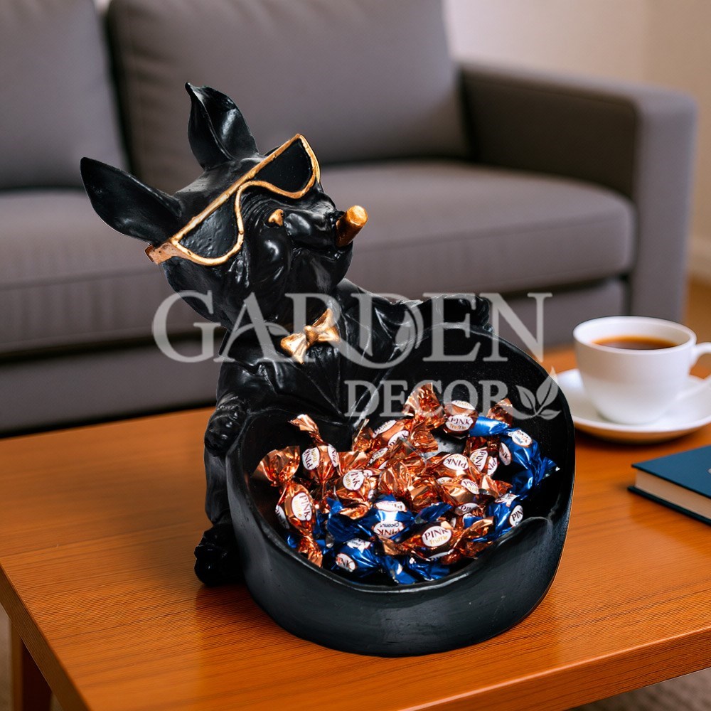 Конфетница декоративная «Бульдог» U09392B — элегантный аксессуар в чёрно‑золотой гамме, выполненный из полистоуна. Стильная фигурка французского бульдога в очках и с бантиком служит удобной чашей для конфет, драже, орехов или мелочей, сочетая в себе декоративность и практичность.