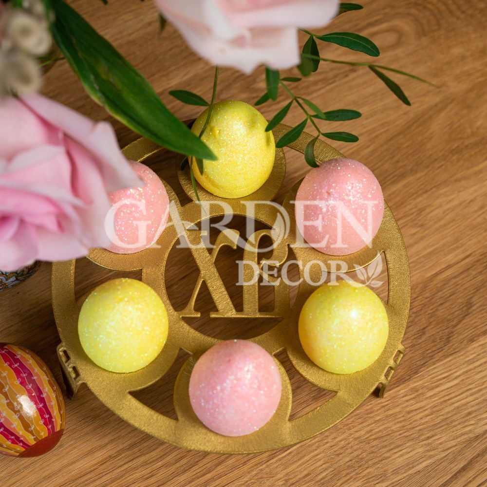Элегантная металлическая подставка для яиц в благородном золотом цвете 750-020G — изысканное украшение к Светлой Пасхе. Изготовленная мастерами, она сочетает в себе прочность металла, традиционную символику («ХВ» — «Христос Воскресе») и утончённый дизайн, который превратит обычную сервировку в праздничное действо. Качественное металлическое покрытие с эффектом золота создаёт тёплое сияние и роскошный вид, устойчиво к потускнению. Надёжно фиксирует яйца, предотвращая их скатывание и повреждение во время праздничного застолья.