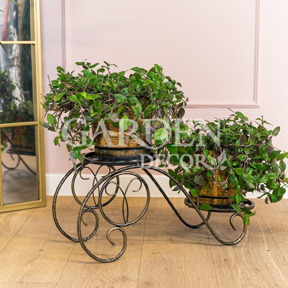 Подставка напольная на 2 растения металлическая 401-035BG — элегантное и практичное решение для размещения ваших горшков в интерьере или на балконе. Изящный кованый дизайн с плавными завитками и ажурными подставками придаёт композиции лёгкость и винтажный шарм, а прочный металлический каркас обеспечивает устойчивость и долговечность.