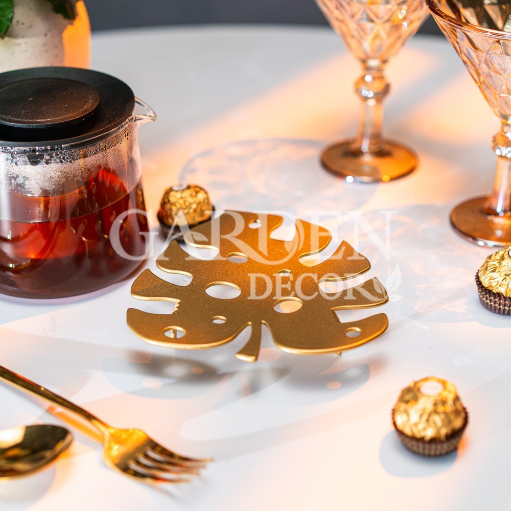 Подставка под горячее «Монстера» 300-131G — золотой лист элегантности. Превратите сервировку стола в искусство! Золотая подставка в виде листа монстеры — это не просто функциональный аксессуар, а изысканный декор для вашей кухни или столовой. Она надёжно защитит поверхность стола, добавив в обстановку ноту тропического шика и уюта. Позвольте себе наслаждаться любимыми напитками и блюдами, не беспокоясь о столешнице. Эта металлическая подставка под горячее станет вашим незаменимым помощником и стильным украшением.