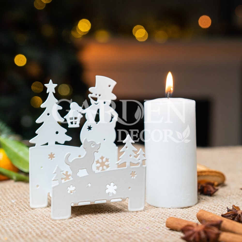 Создайте праздничное настроение дома с новогодним подсвечником «Снеговик» 730-071W. Белый металл с ажурными вырезами в виде ёлок, снеговика с фонариком и забавного щенка красиво рассеивает свет свечи, наполняя пространство мягким зимним сиянием.